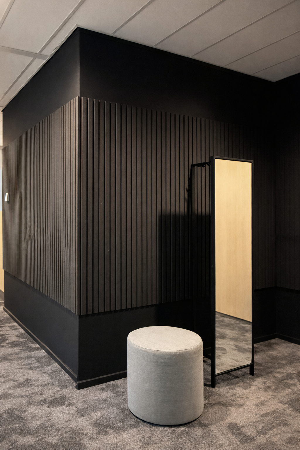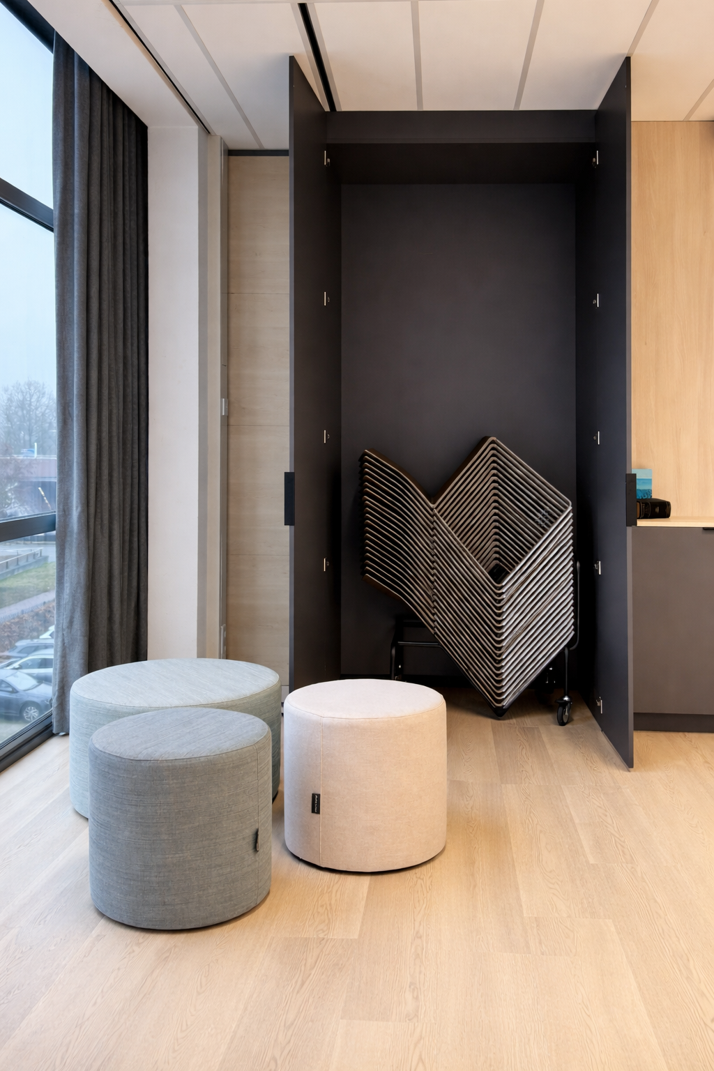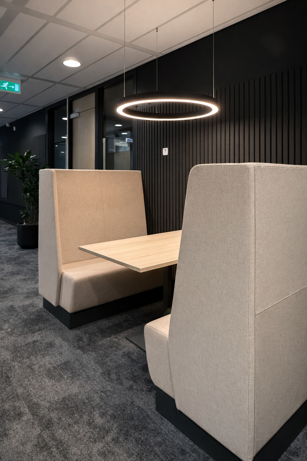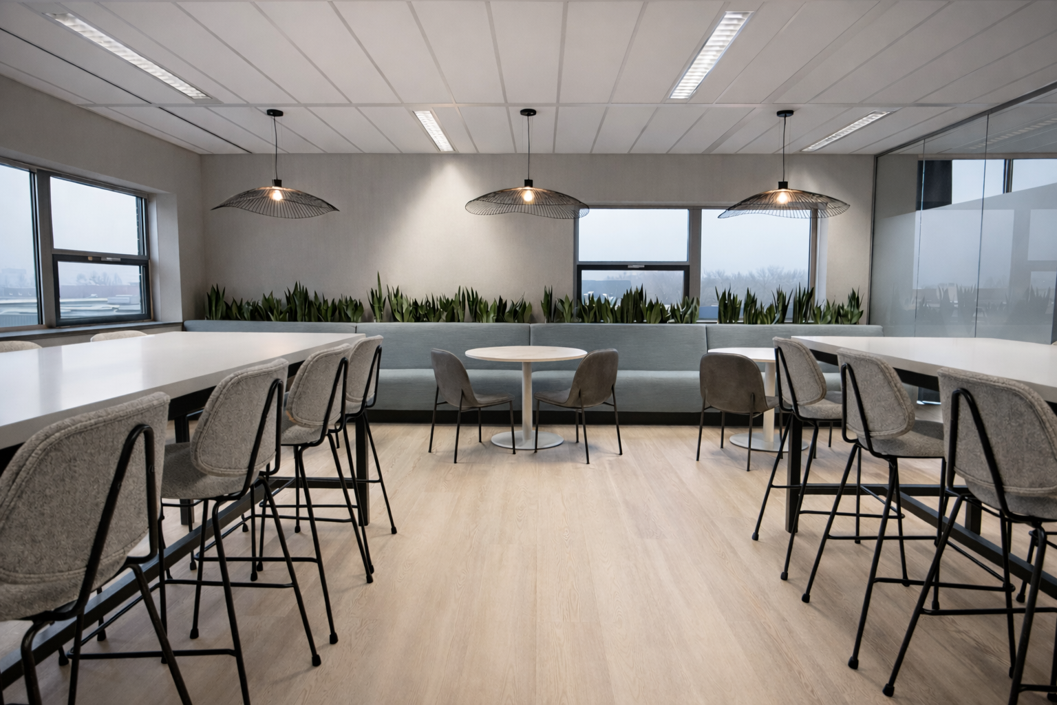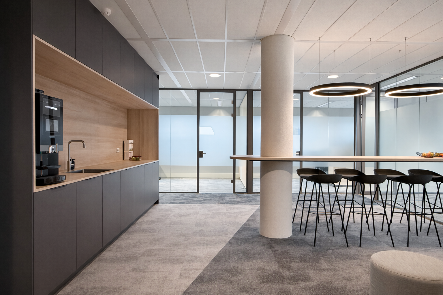 Het volledige pand kreeg een make-over: van stijlvol en comfortabel tapijt tot maatwerkelementen die perfect aansluiten op de ruimte. Zowel het kantoor- als het kantinemeubilair werd vernieuwd, aangevuld met sfeervolle verlichting. Voor privacy én uitstraling zijn glazen wanden geplaatst, voorzien van verfijnde, op maat ontworpen raamfolie.