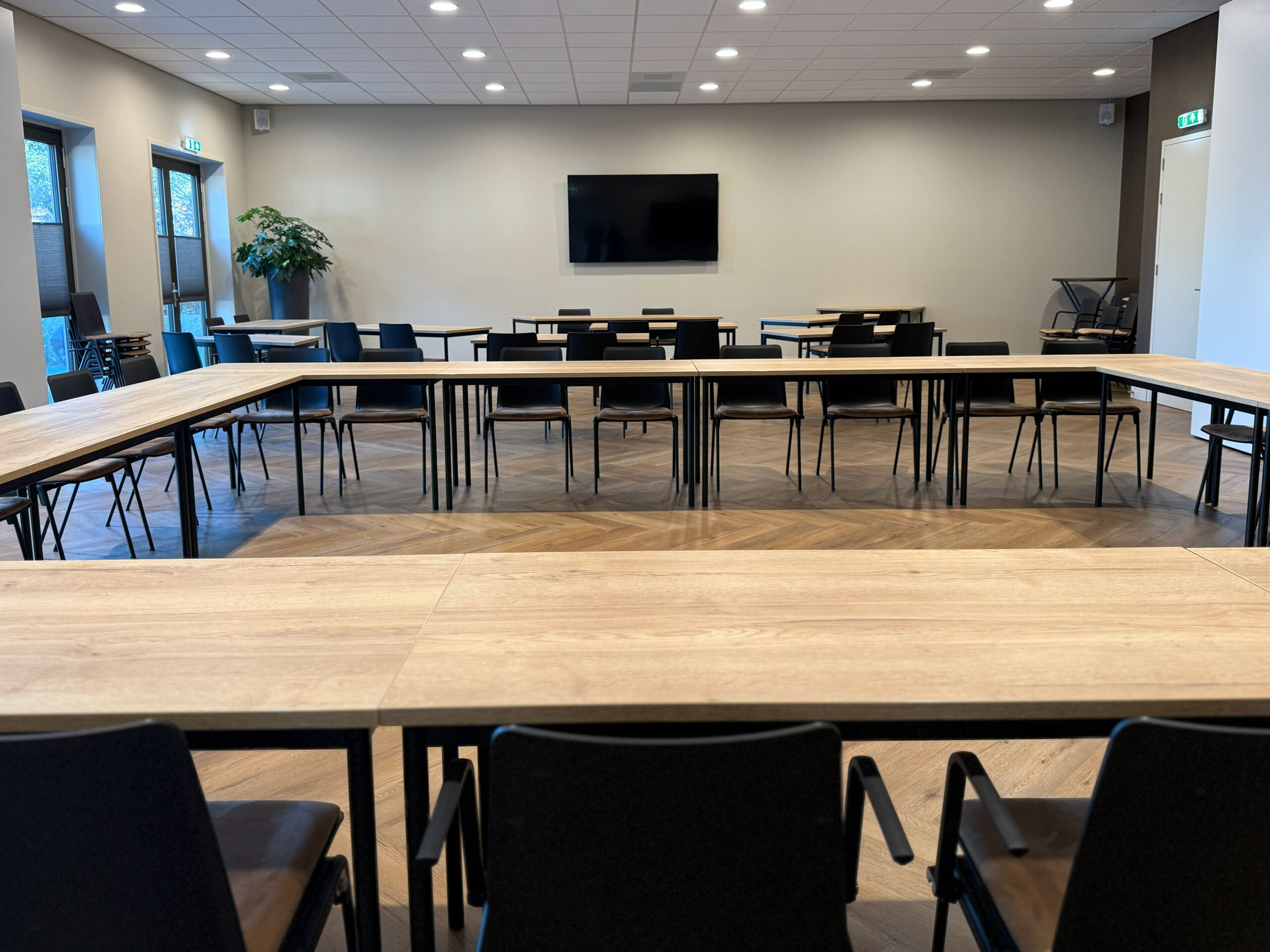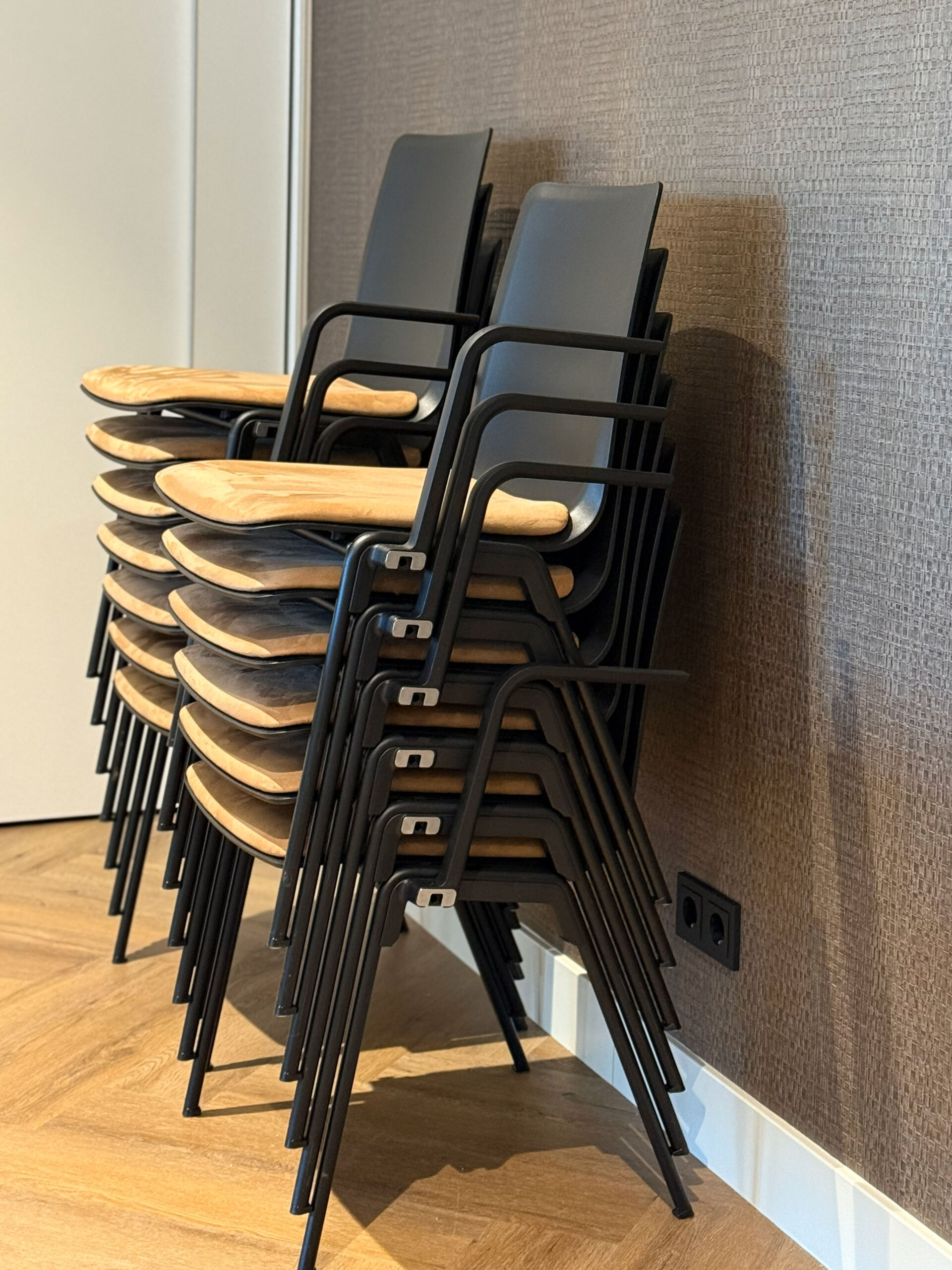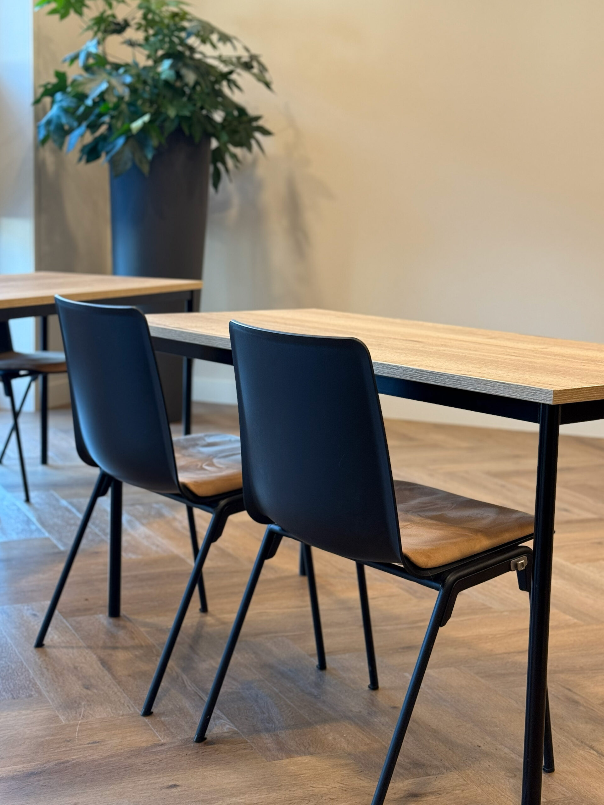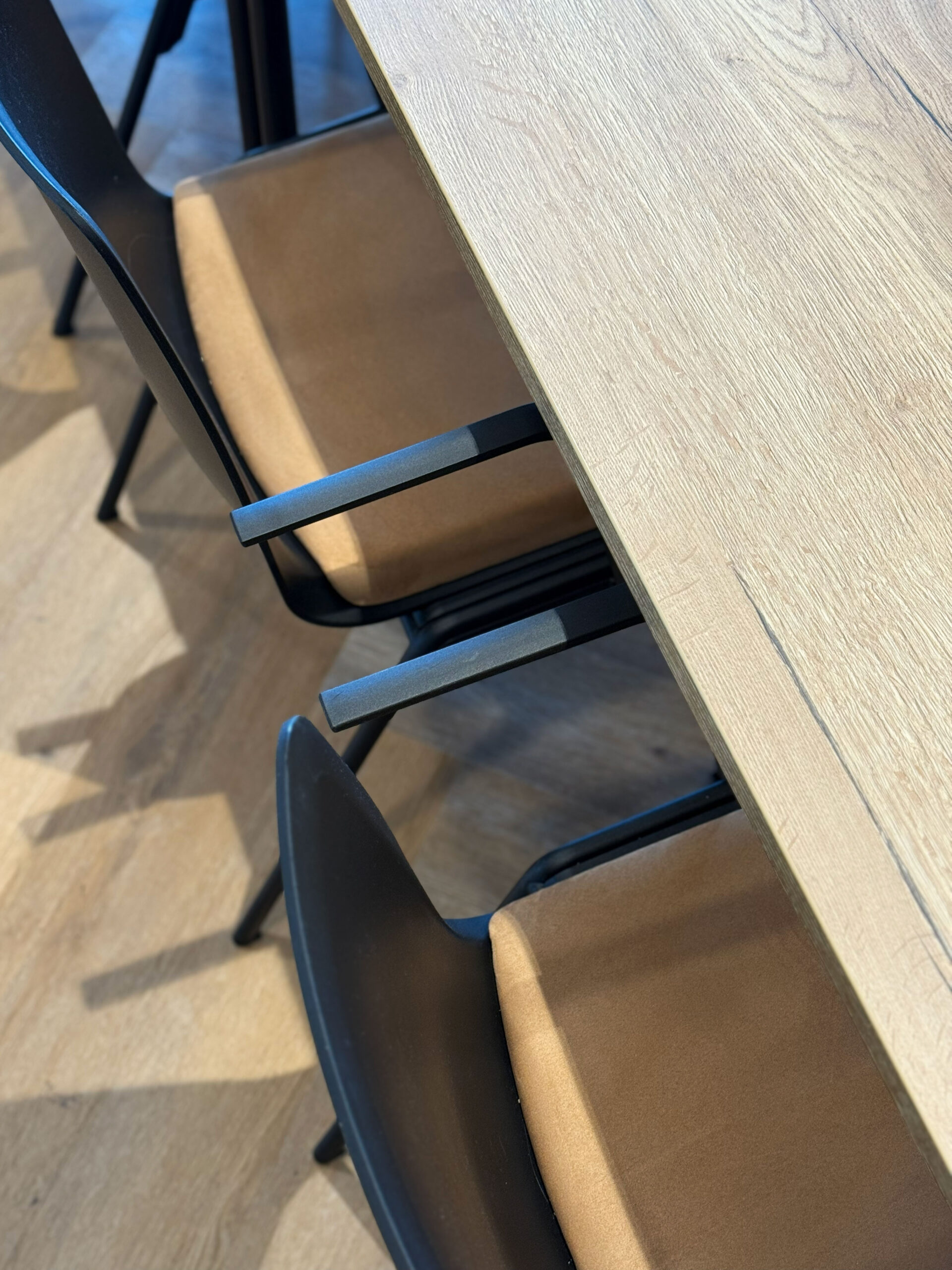 De ruimte is nu verrijkt met prachtige stoelen: een stijlvolle combinatie van contrasterend zwart en een lichte stof. Ze sluiten perfect aan bij de al gekozen tafels en blenden mooi in het geheel. Een resultaat om trots op te zijn!
